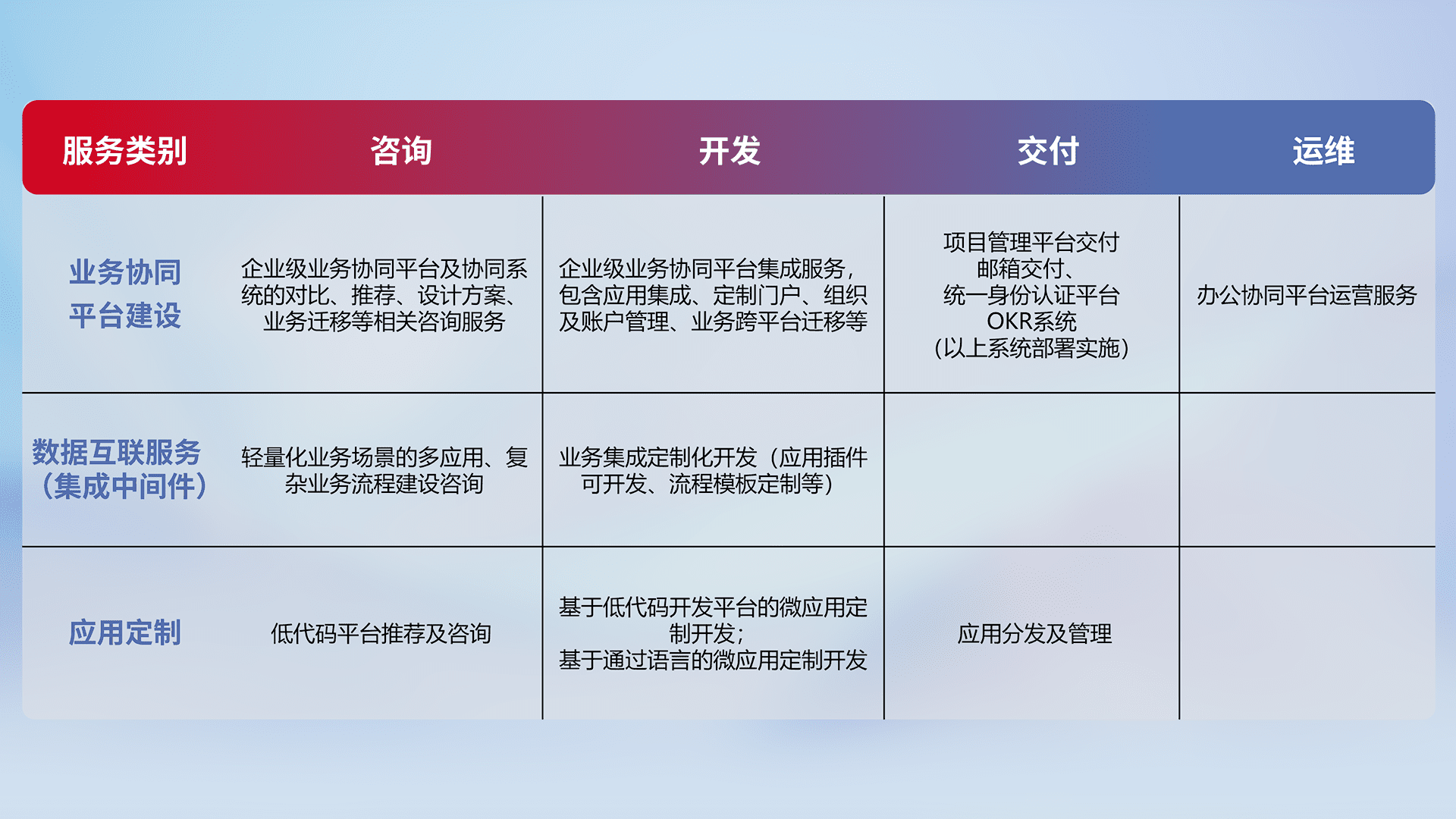 针对钉钉、、、、企微、、IDaas等平台级产品提供产品的规划、、、、方案、、、、交付、、、定制化开发等服务,,,,实现如统一协同办公、、、、智能客户服务、、、混合会议管理、、智能数据查询、、、、等业务场景,,,,实现数字化转型。。