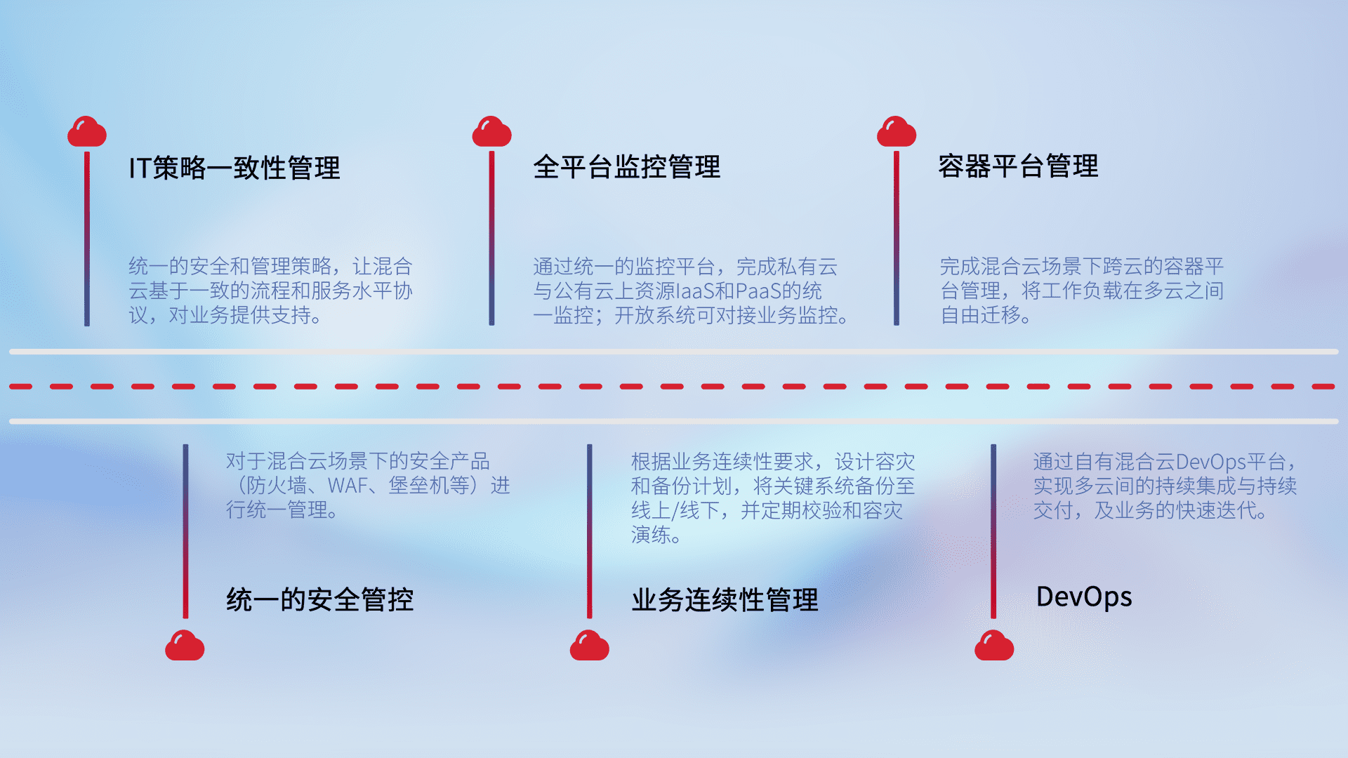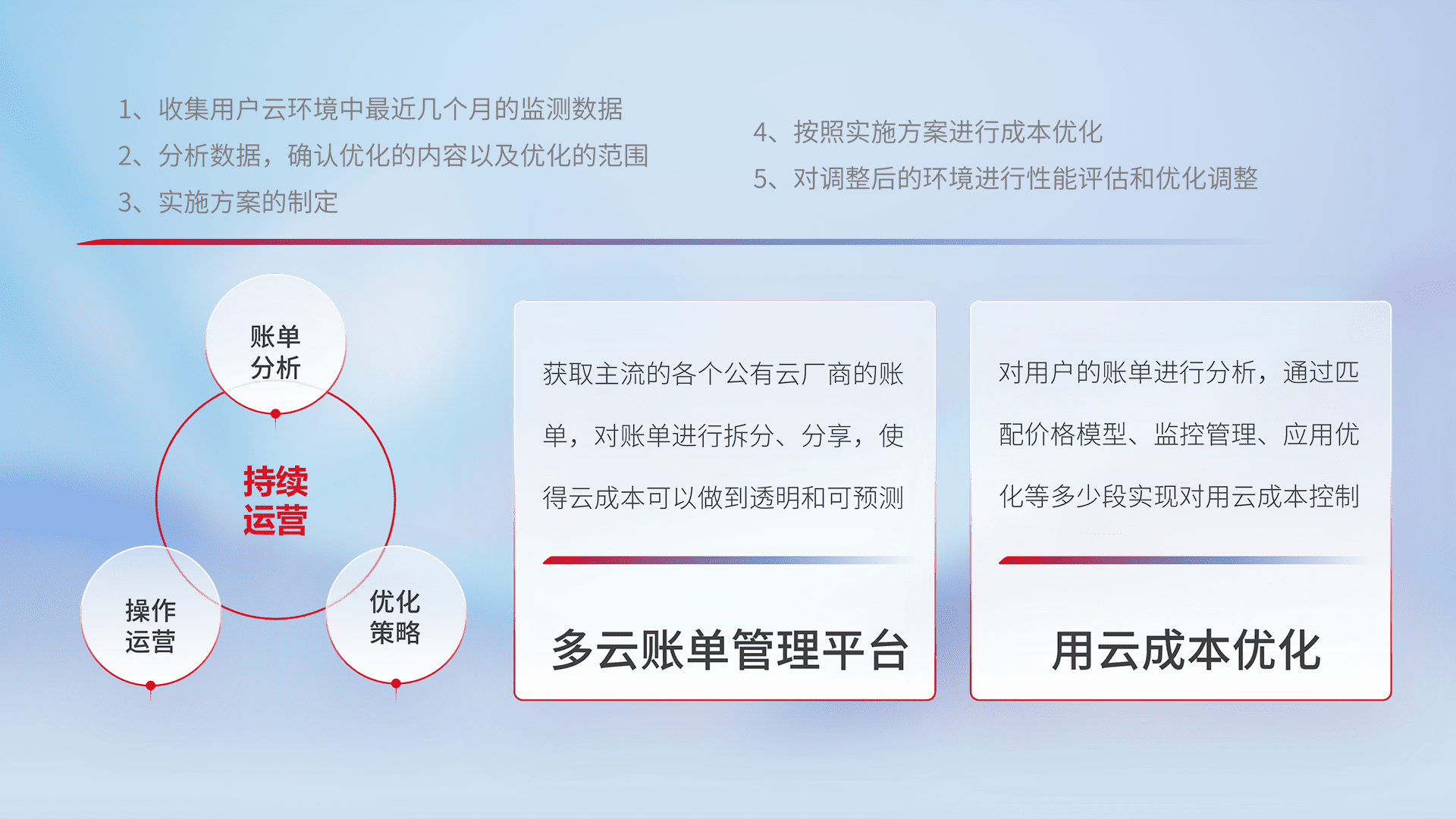 通过多云纳管,,以统一的资源数据模型把客户的云资源进行抽象和封装,,,,进而实现对多云资源的统一操作,,保障云资源管理的可靠性、、稳定性与可用性。。量身定制化运维内容,,,配置、、、、开发运维、、、、补丁管理、、、备份、、监控、、、、认证和访问管理、、审计和日常巡检等,,保障在用云过程中的可靠度,,,稳定度以及高可用率。。